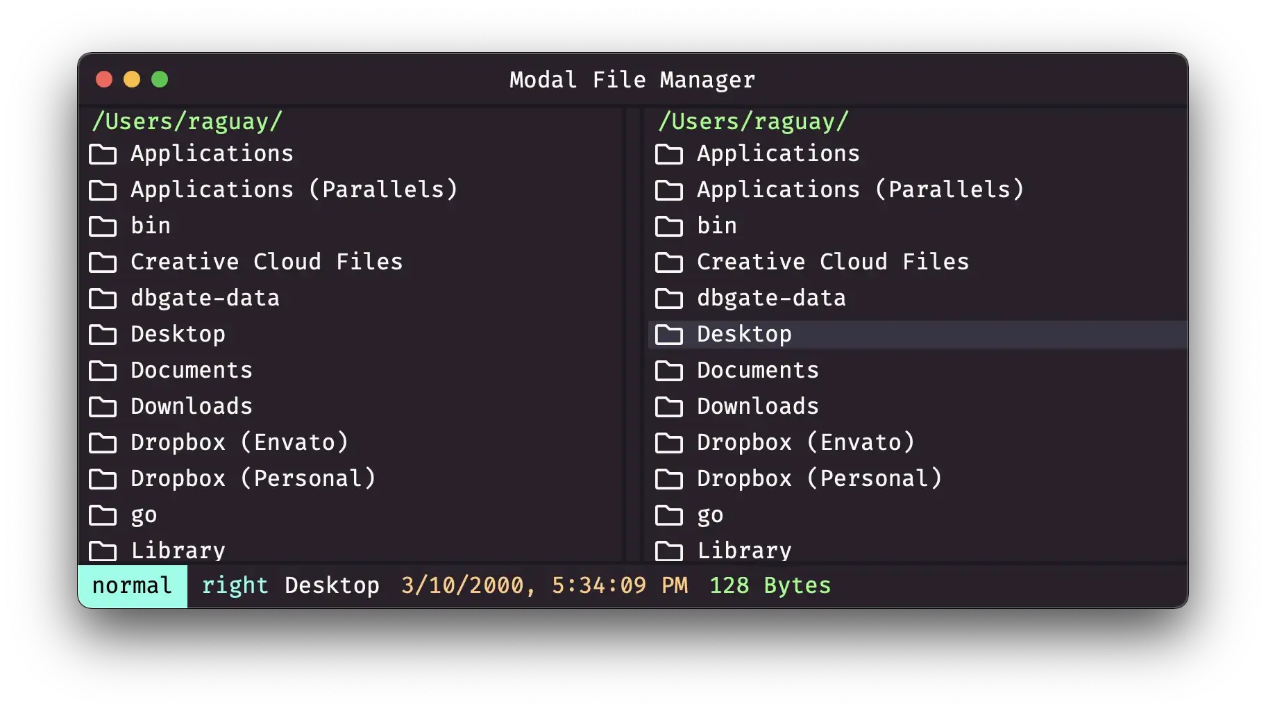 Modal File Manager is a dual pane file manager using web technologies. My original design was based on NW.js and can be found here. This version uses the same Svelte based frontend code (but it has be greatly modified since the departure from NW.js), but the backend is a Wails 2 implementation. By using this implementation, I no longer use command line rm, cp, etc. commands. It is fully coded using Go and runs much faster than the previous versions.